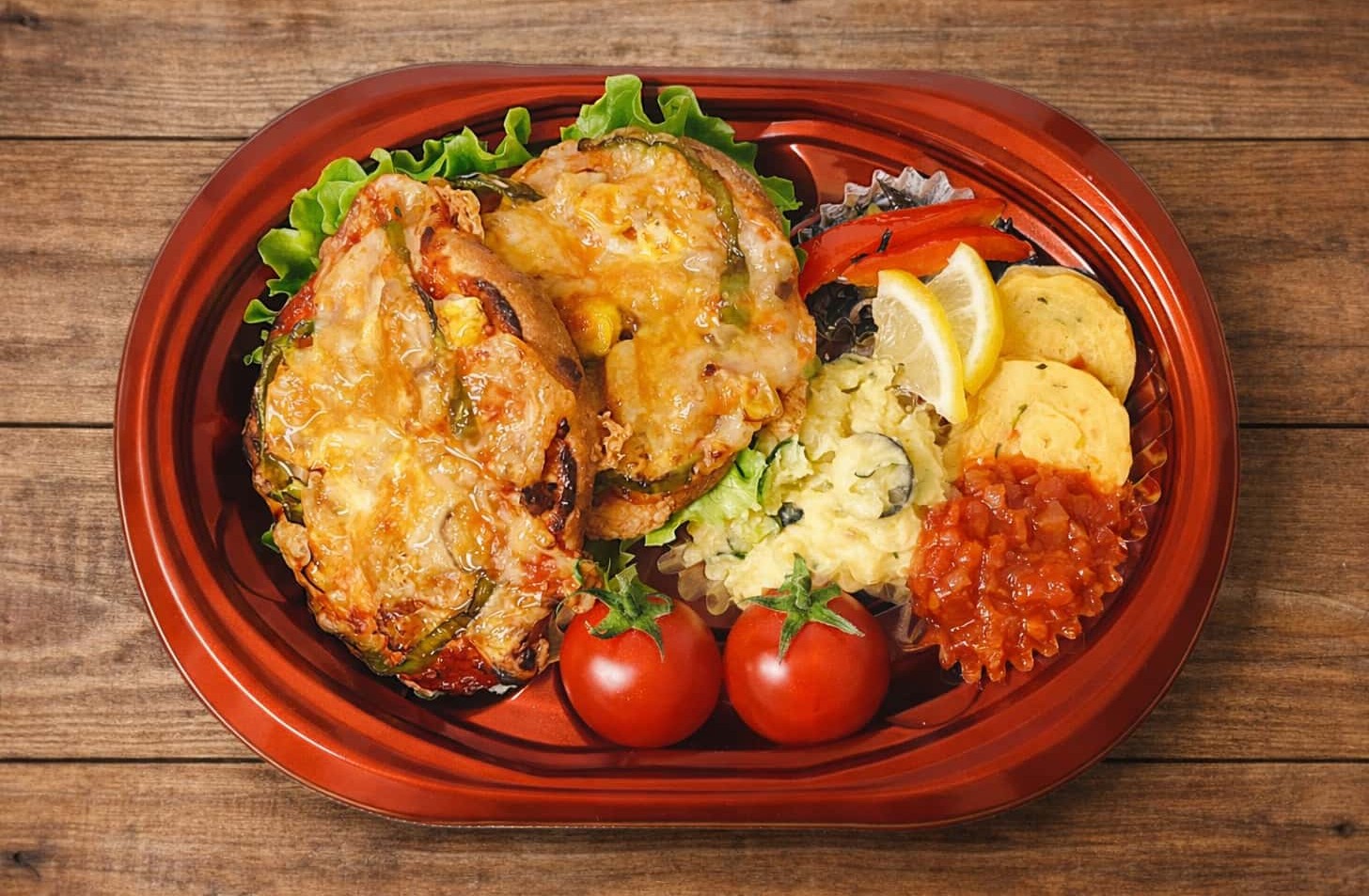 気仙沼市は2009 年に「スローフード宣言」を行い、地域の食文化を大切に育んできました。今回のお弁当は、その発祥地イタリアの料理をヒントに、宮城の食材を融合させた一品です。主食はわかめを練りこんだ生地に、みそトマトソースとバジル香るカツオの肉団子をのせたオリジナルピザ。副菜にはトマトソースをかけたツナマヨ卵焼き、ひじきのマリネ、オリーブ入りサツマイモサラダを添えました。新鮮な地元食材を、楽しくおいしく味わえる「地産地消イタリアン弁当」です。