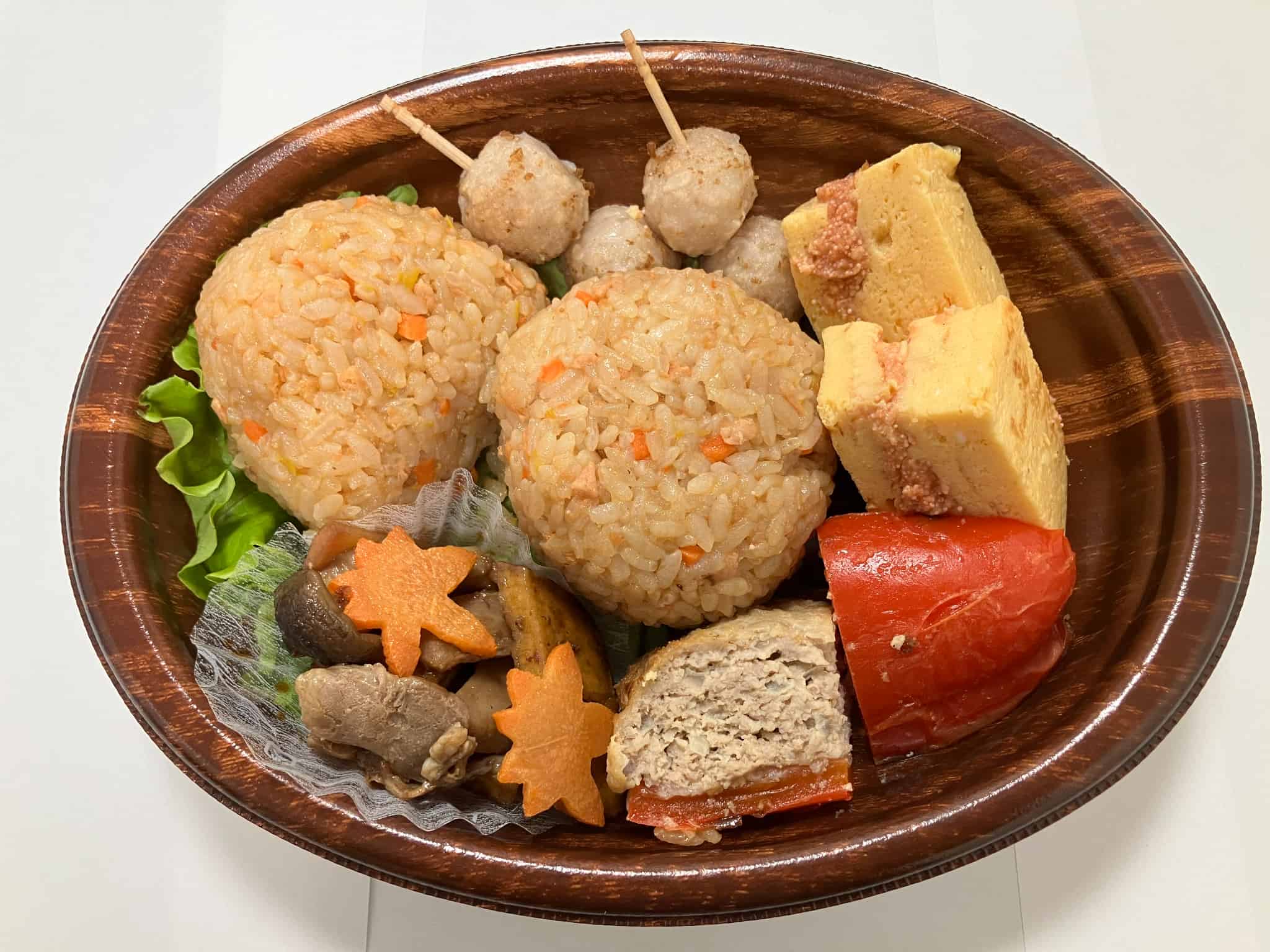 秋になると栗駒山はすごくきれいな紅葉が広がっています。私達はそれを再現しようと思い紅葉の色を使ったお弁当を作りました。まずは鮭とパプリカ、しめじを入れた炊き込みご飯のおにぎりにすることで栗駒山を再現しました。おかずも赤いパプリカと秋の果物のりんごを使用し、秋を感じられる工夫をしました。さらに大葉をいれることで完全に紅葉してない葉を表現しました。主に食材を作ってくれた農家の方に感謝の気持ちを込めて作りました。