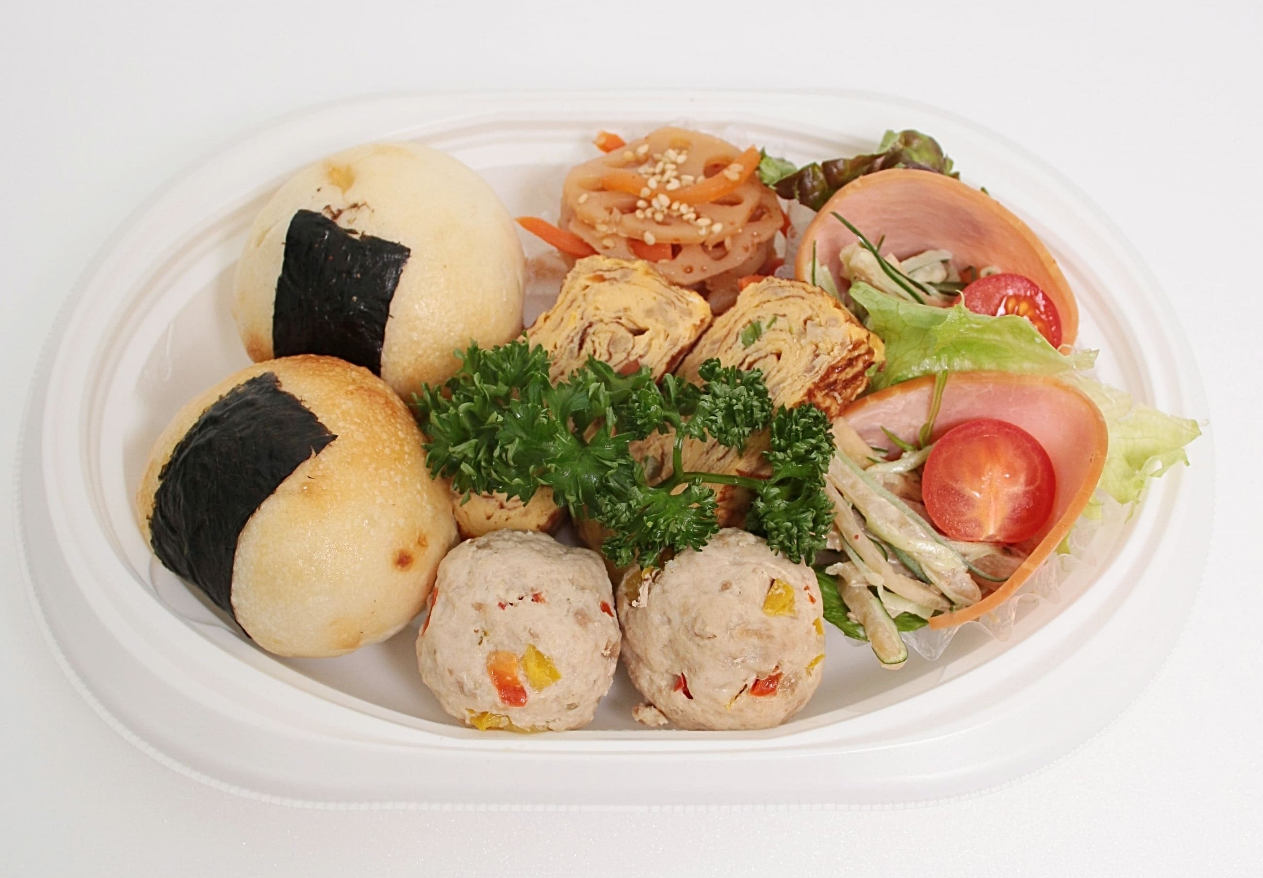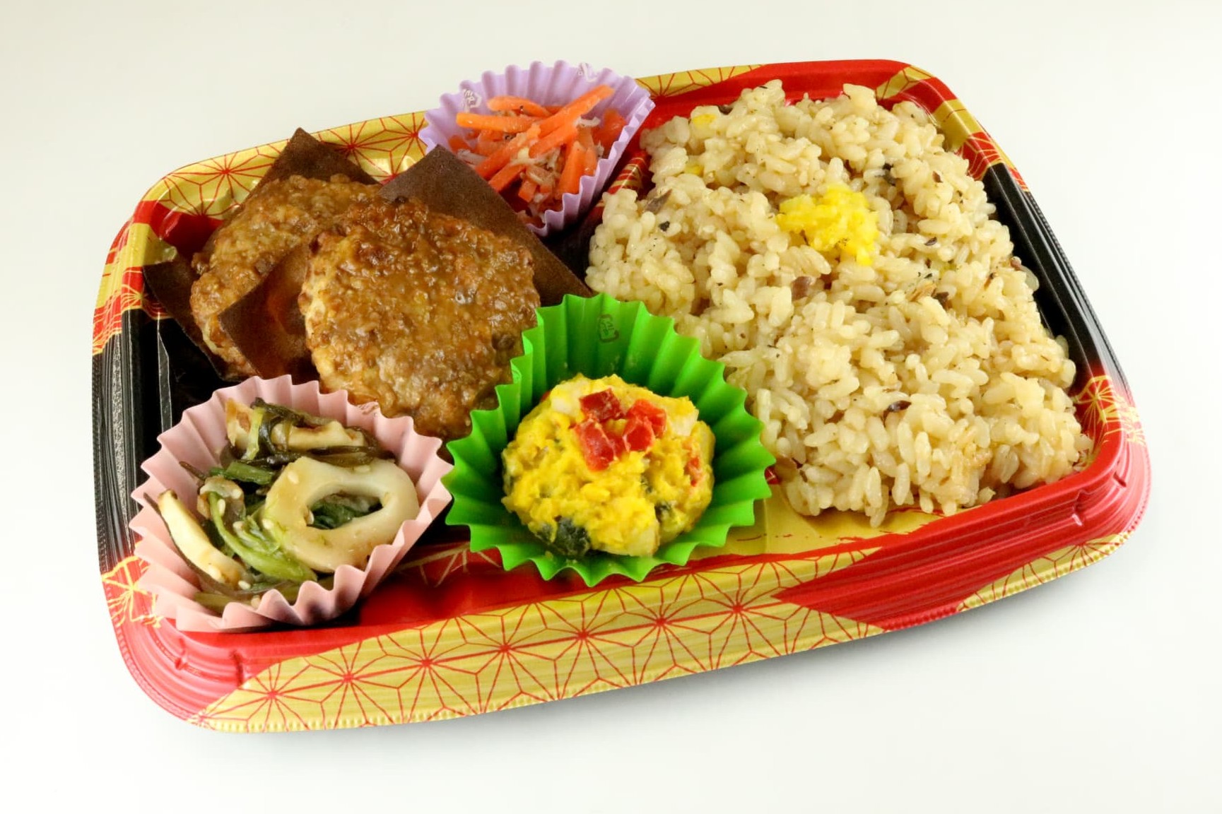 五感で楽しみ、栄養もたっぷりなお弁当です。主食はもち米入りのご飯にさんまと大島産ゆずを合わせ、もちもち食感と香りを楽しめます。主菜は豆腐・蓮根・おから入りの味噌味ハンバーグで、ふんわりとした食感と食べ応えを実現。副菜にはかぼちゃサラダ、人参としらすのラぺ、小松菜と竹輪の塩昆布和えを加え、彩り・香り・味わい・音・食感、すべての五感を満たす体にも心にもやさしい一箱です。