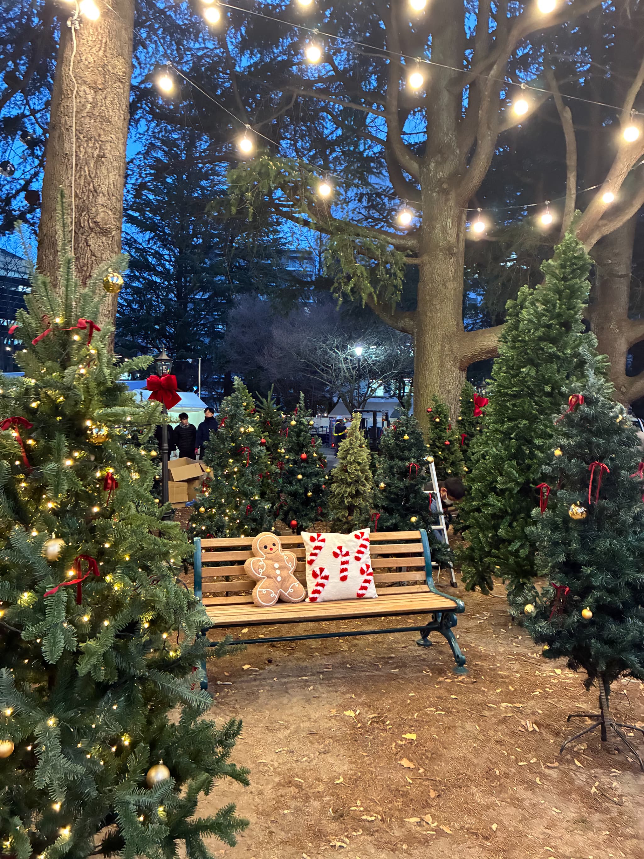 たくさんの小さいツリーが並ぶ中にはベンチが!