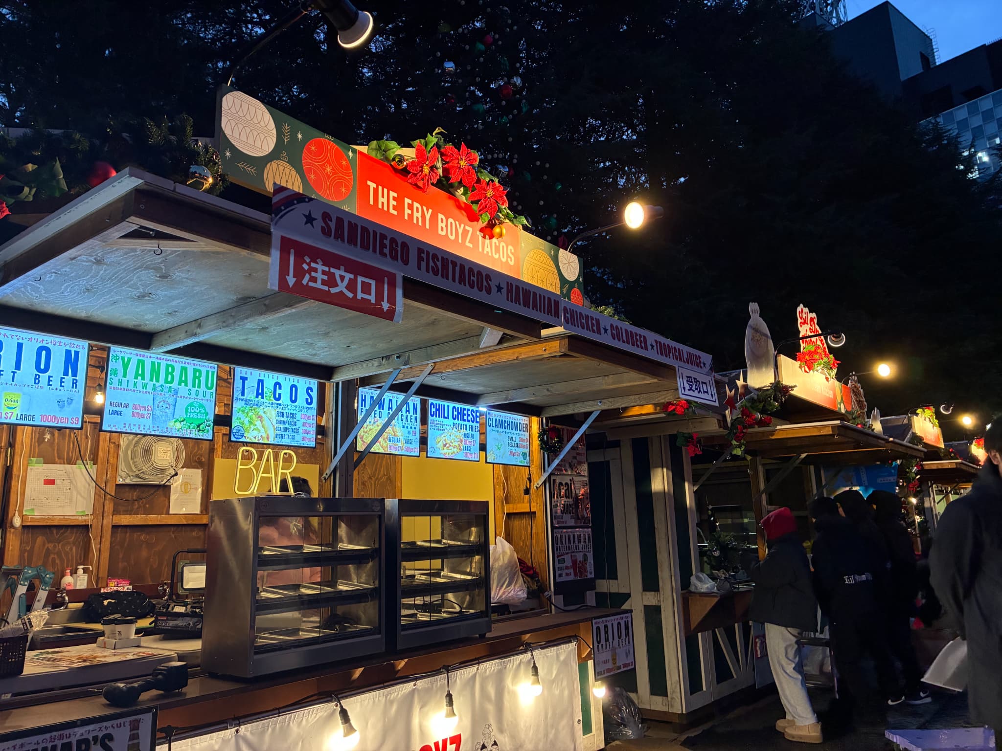 寒空の下で食べると格別に美味しいシチューやソーセージ、フライドチキン。甘いものは、チュロス、ケーキ、フルーツ飴まで勢ぞろい。