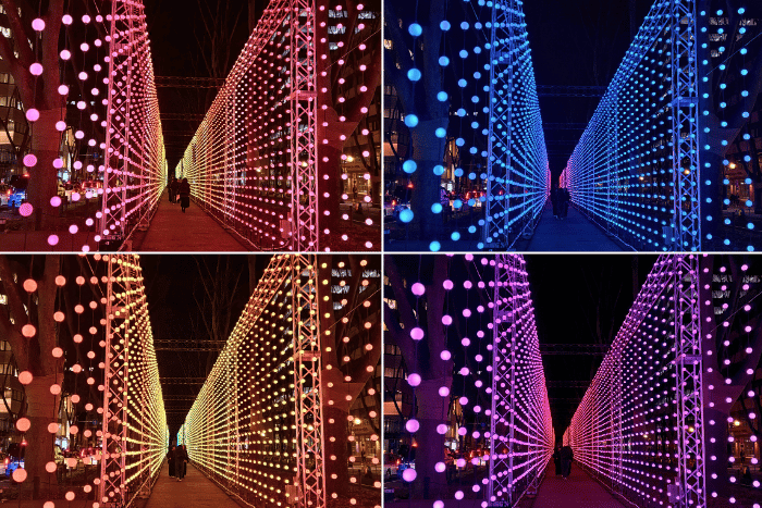 見てください、この「光の壁」! 外から眺めるのと、中を歩くのとでは雰囲気がガラリと変わります。次々と色が変化していく様子は、ずっと見ていても飽きない美しさです。