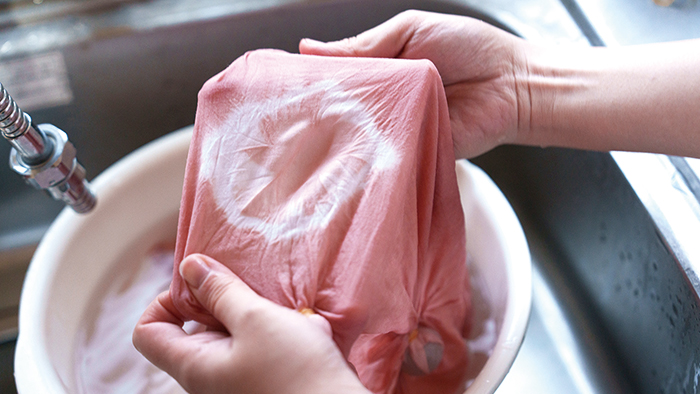 折れた枝が廃材として廃棄されることから「この美しい桜を残していきたい」その思いから日本の伝統的な草木染めの技術を使って誕生したのが「一目千本桜染め」です。