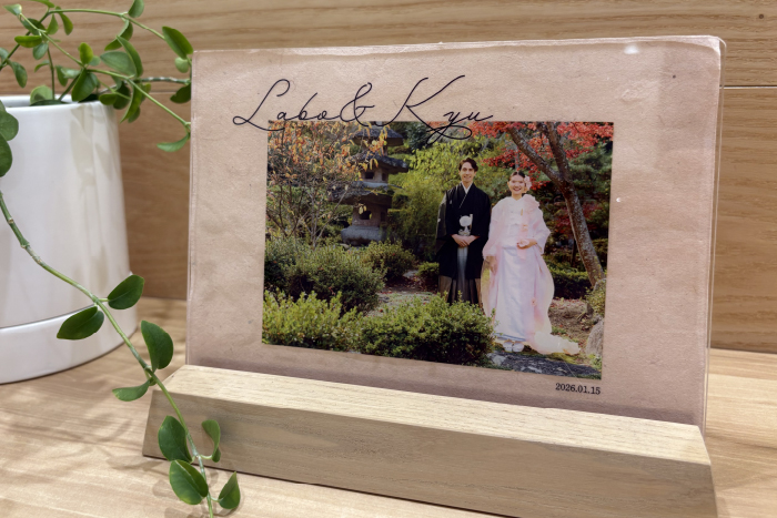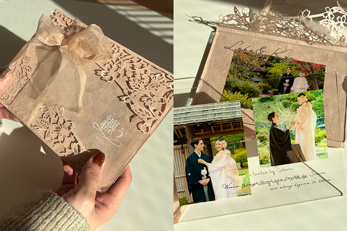 一目千本桜染め衣装を纏って撮影をした思い出に、一目千本桜染めで染めた和紙でパッケージしたフォトアルバムをご用意しました。写真はアクリル板にUV印刷をしてお渡しします。
