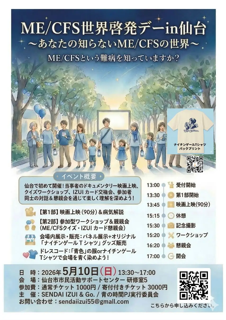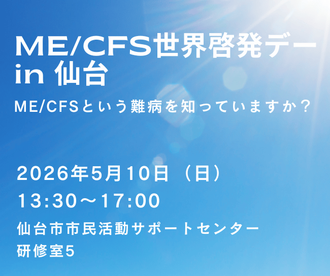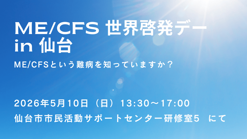この病気の認知度を上げ、理解の輪を広げるために、5月10日(日)に仙台初となる啓発イベント「ME/CFS世界啓発デーin仙台」が開催されます!